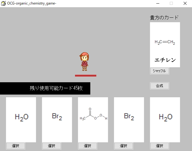 今回のゲームは、有機合成を起こして教授を倒すのが目的のカードバトル(?)ゲームです。