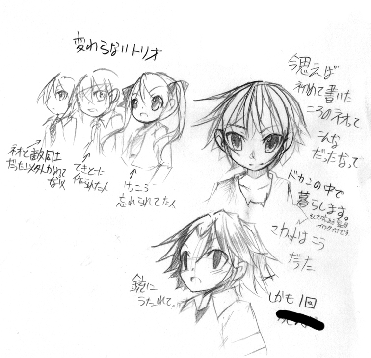 ネオのアホ毛は、それまであまり意識したことは無かったのですが、ある時クラスの男子に「お前アホ毛あるんだなww」っていわれて以来、なんだか少しうれしくて、意識して描いていた物だったりします。