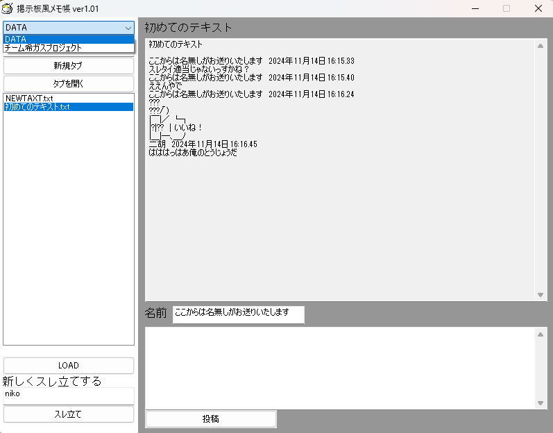 そこに名前を入力して新規タブボタンを押したら新しいフォルダの作成とそこで作るスレッド(txtファイル)の名前を決めれます。